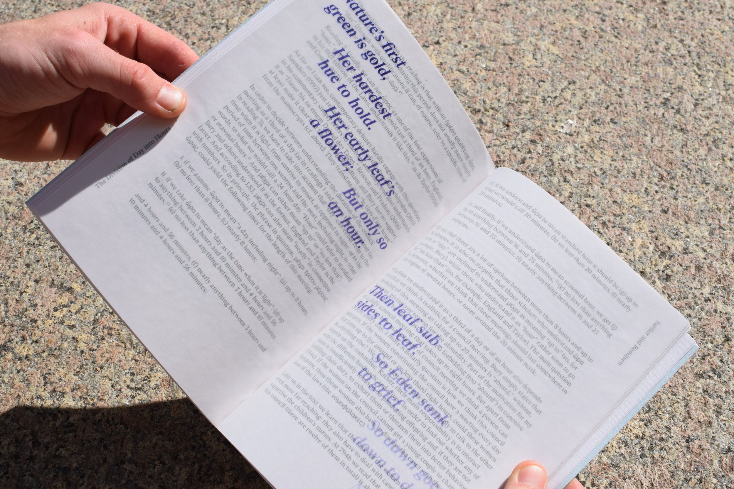 This book combines essays about the development of timekeeping that are traditionally typeset, with poetry about time overlayed on vellum. The cover is a blind emboss using a letter press.