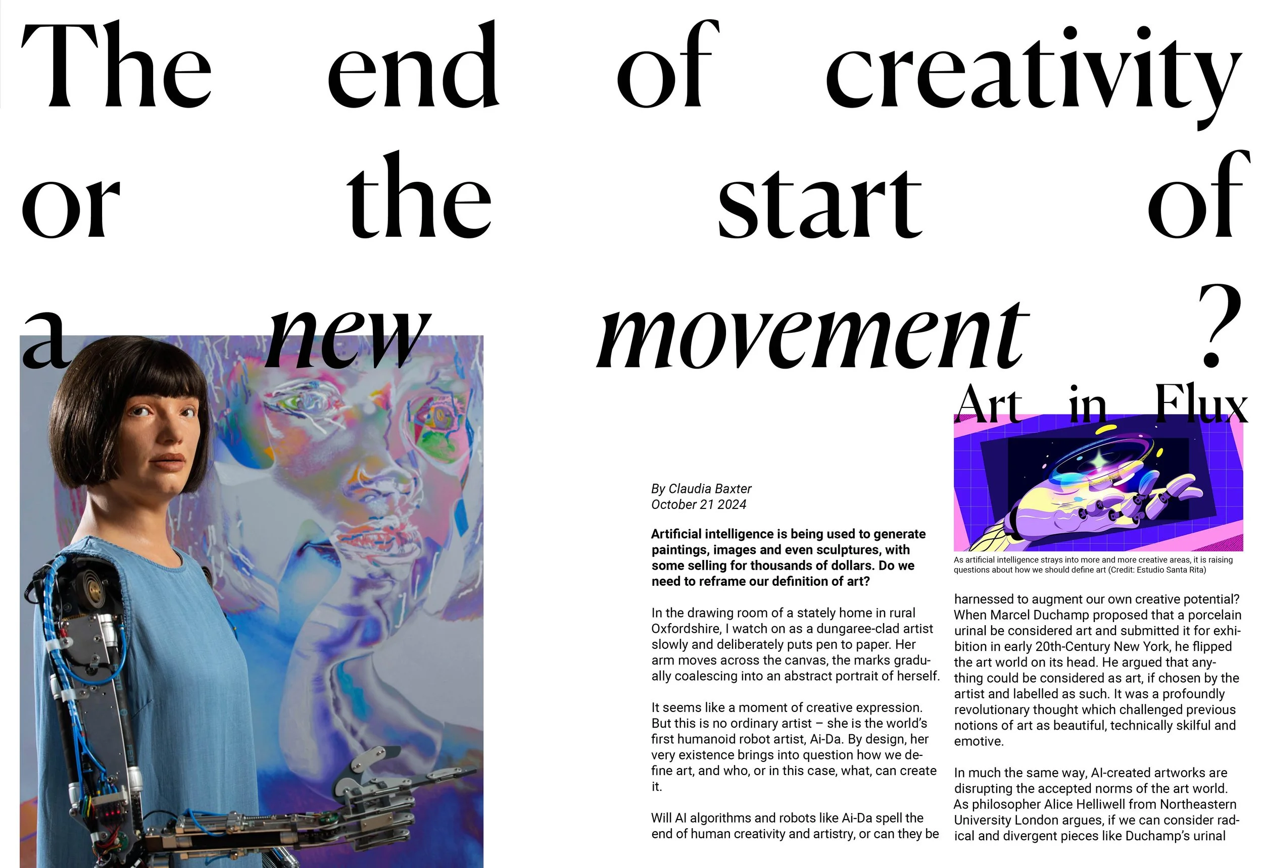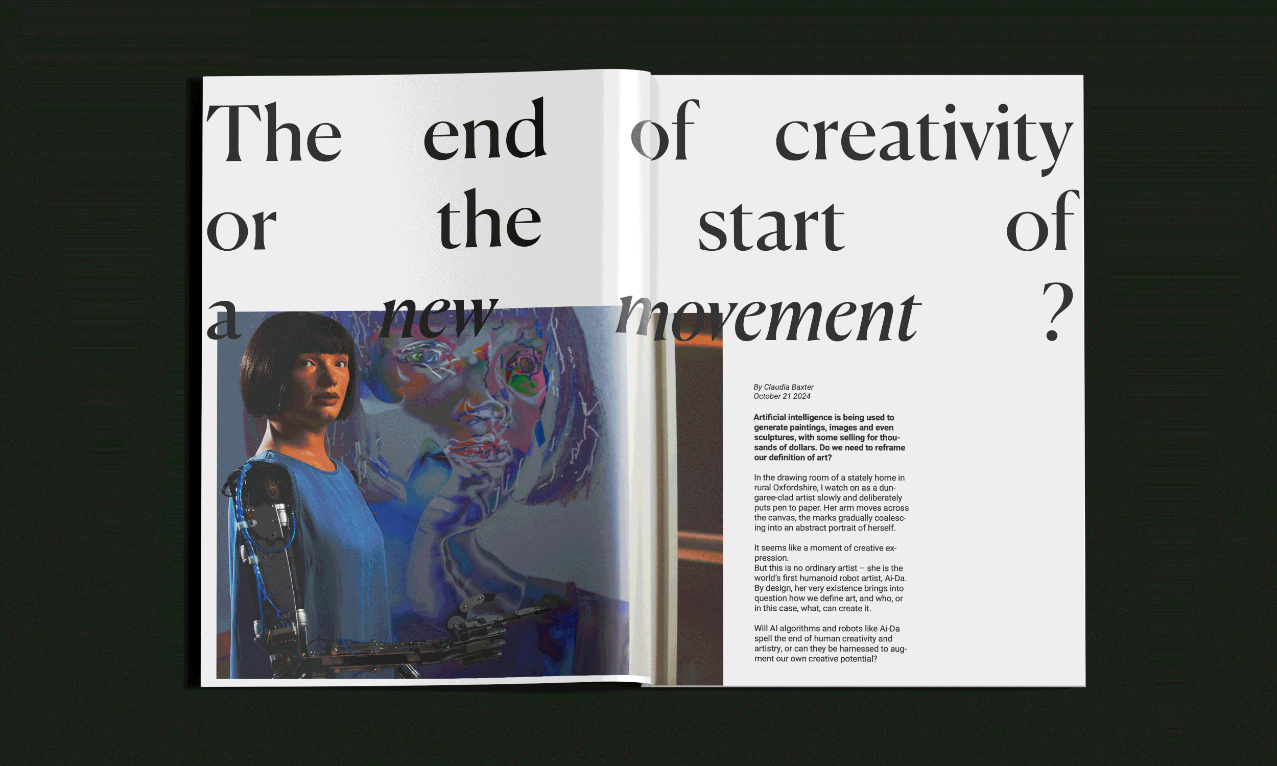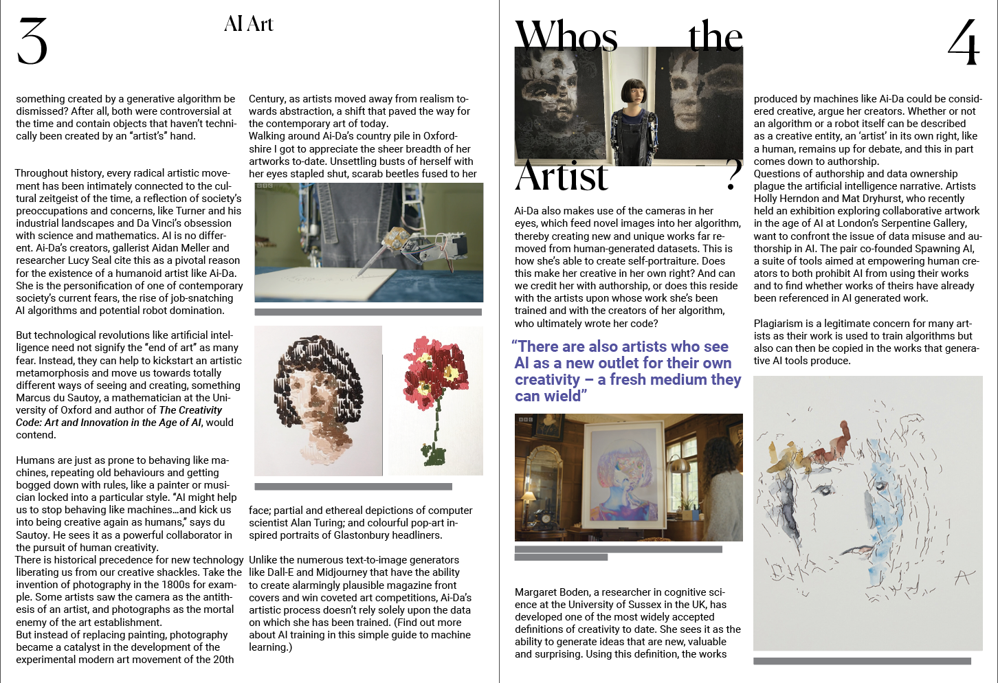 In this exercise I created an editorial layout for an article about a robot artist. The images are blurred and on top is an AI prompt that explains the image. I also places images/ideation of other spread ideas to get a sense of my process for the spreads.