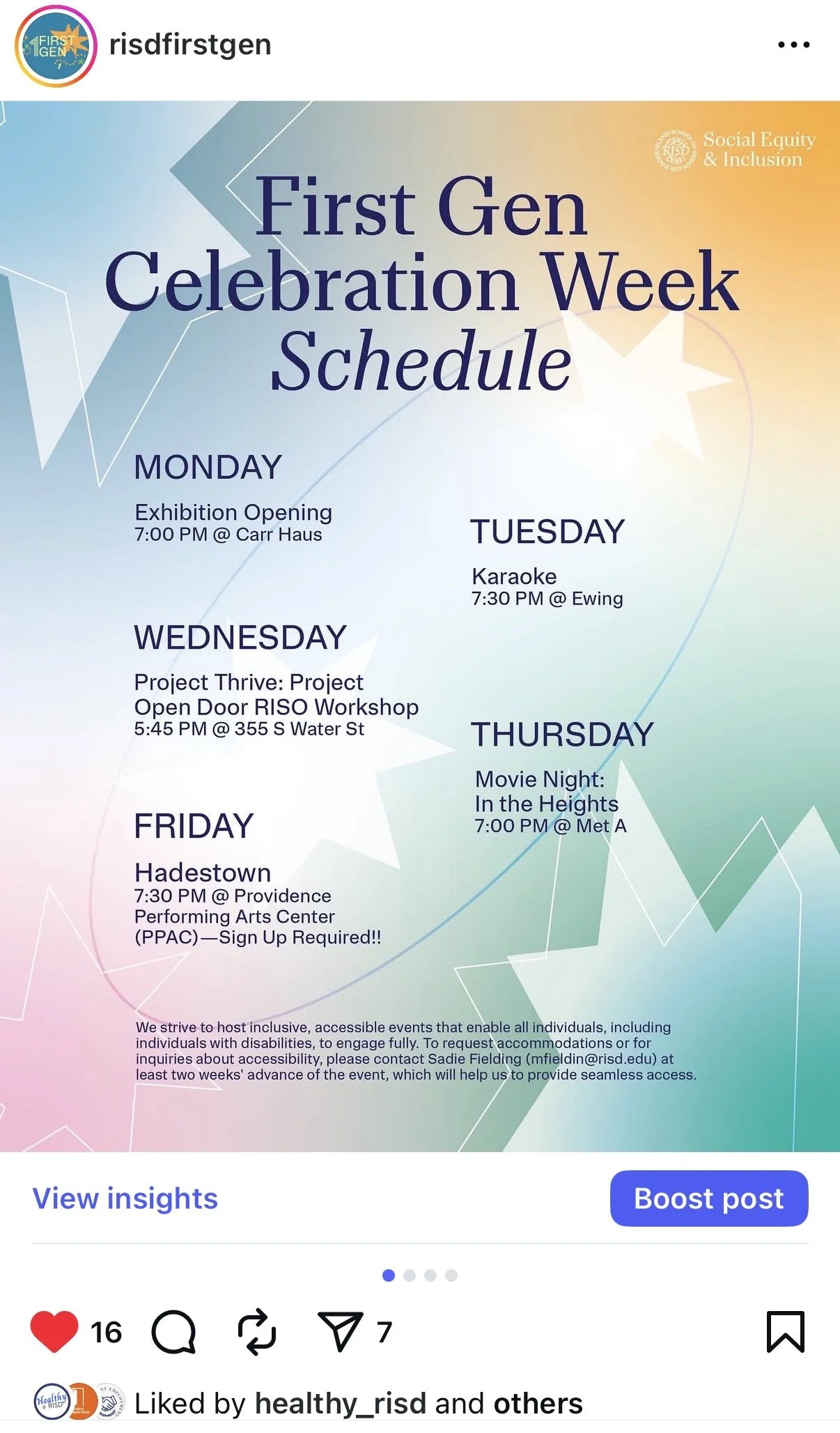 As a Project Thrive advisor, RISD’s first generation club, I work to coordinate programming for first-get students. However, when I joined I noticed that the social media was very rarely used, and though it a missed opportunity to get additional engagement to our weekly events. So I decided to take over the account, raising engagement by 700%. Here’s some examples of the posters I created! I also create first gen branding from time to time, like our special profile picture made for first gen week.